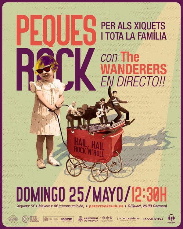 Peques Rock, un espectáculo para aprender y disfrutar con toda la familia de la historia del Rock And Roll. Sonarán temas de Jerry Lee Lewis, Elvis Presley, Little Rickard, Chuck Berry y muchísimos más a cargo de nuestros amigos The Wanderers.